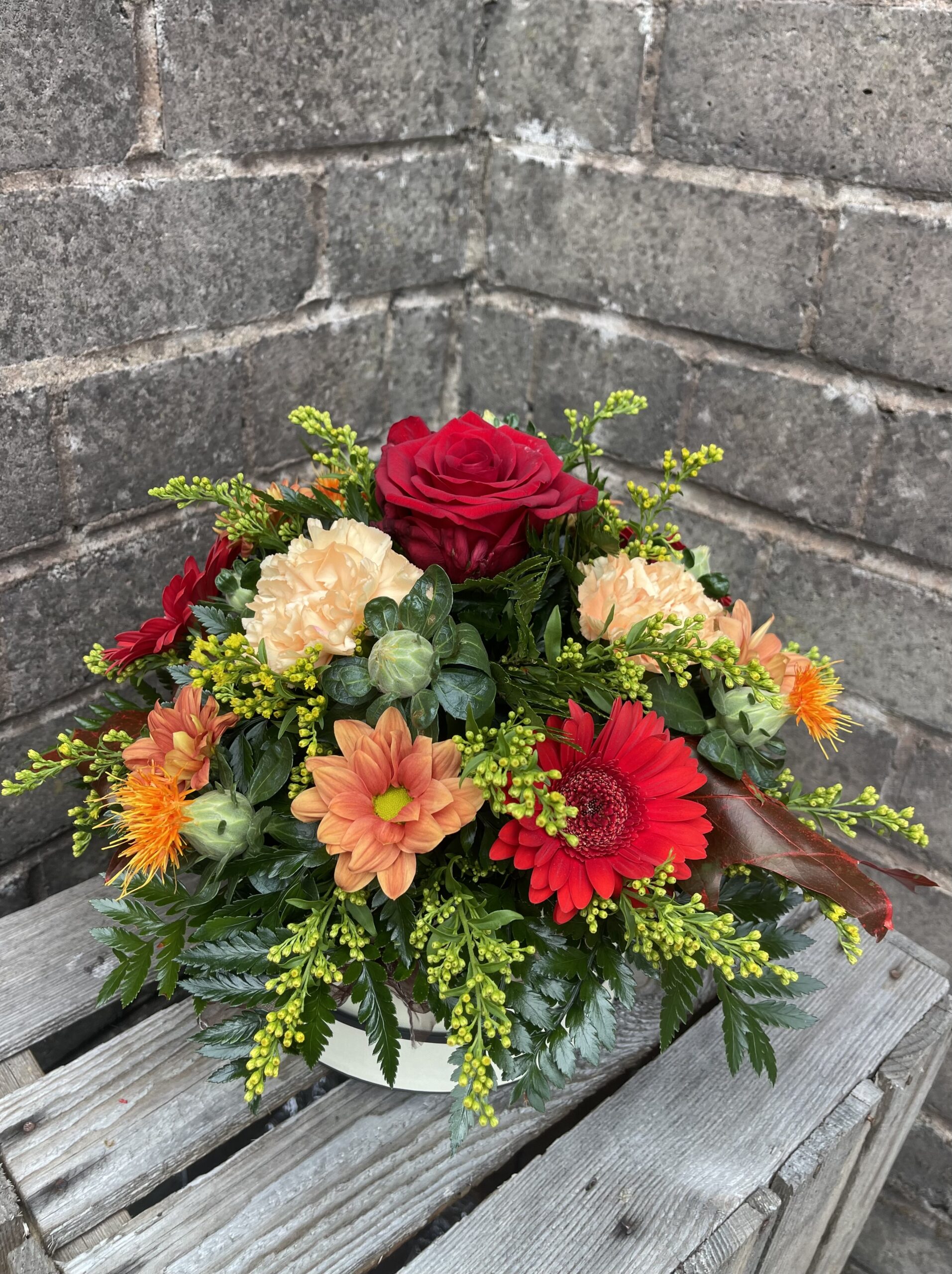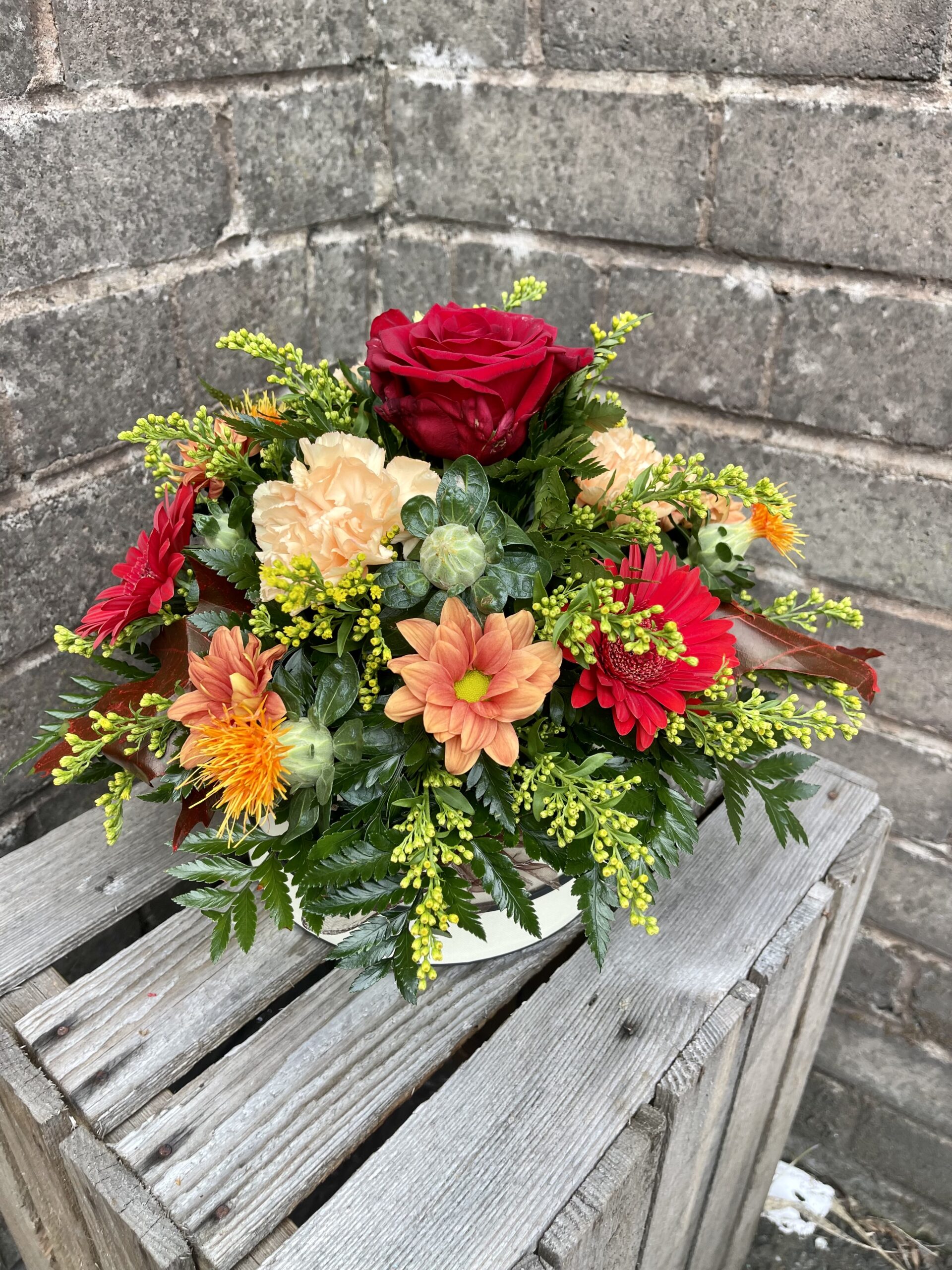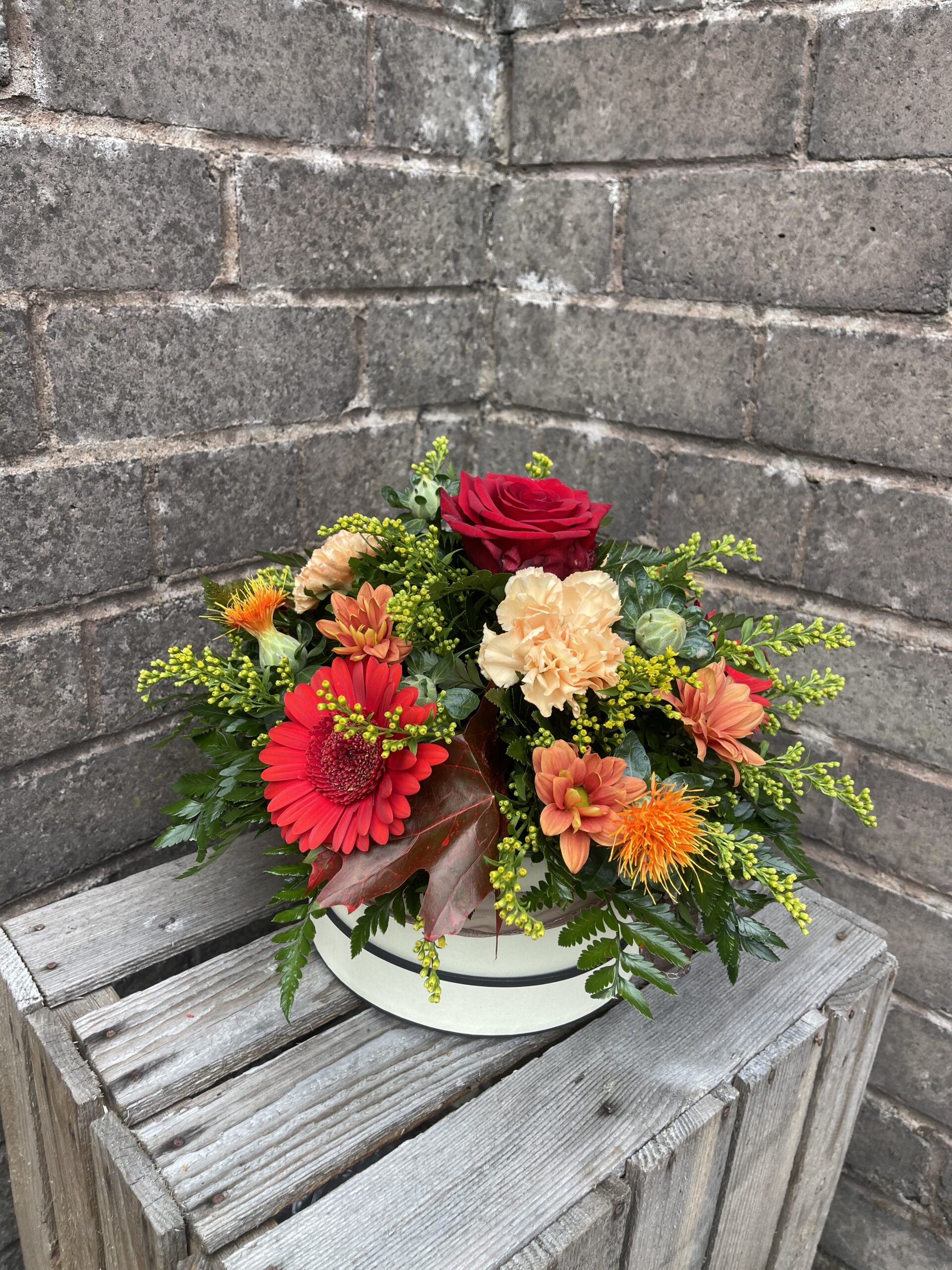 Mixed Flowers arranged in oasis in a hatbox, with an autumn theme and colours. please note that our stock of flowers and varieties do change daily so the flowers will be similar to image but not exactly as the image