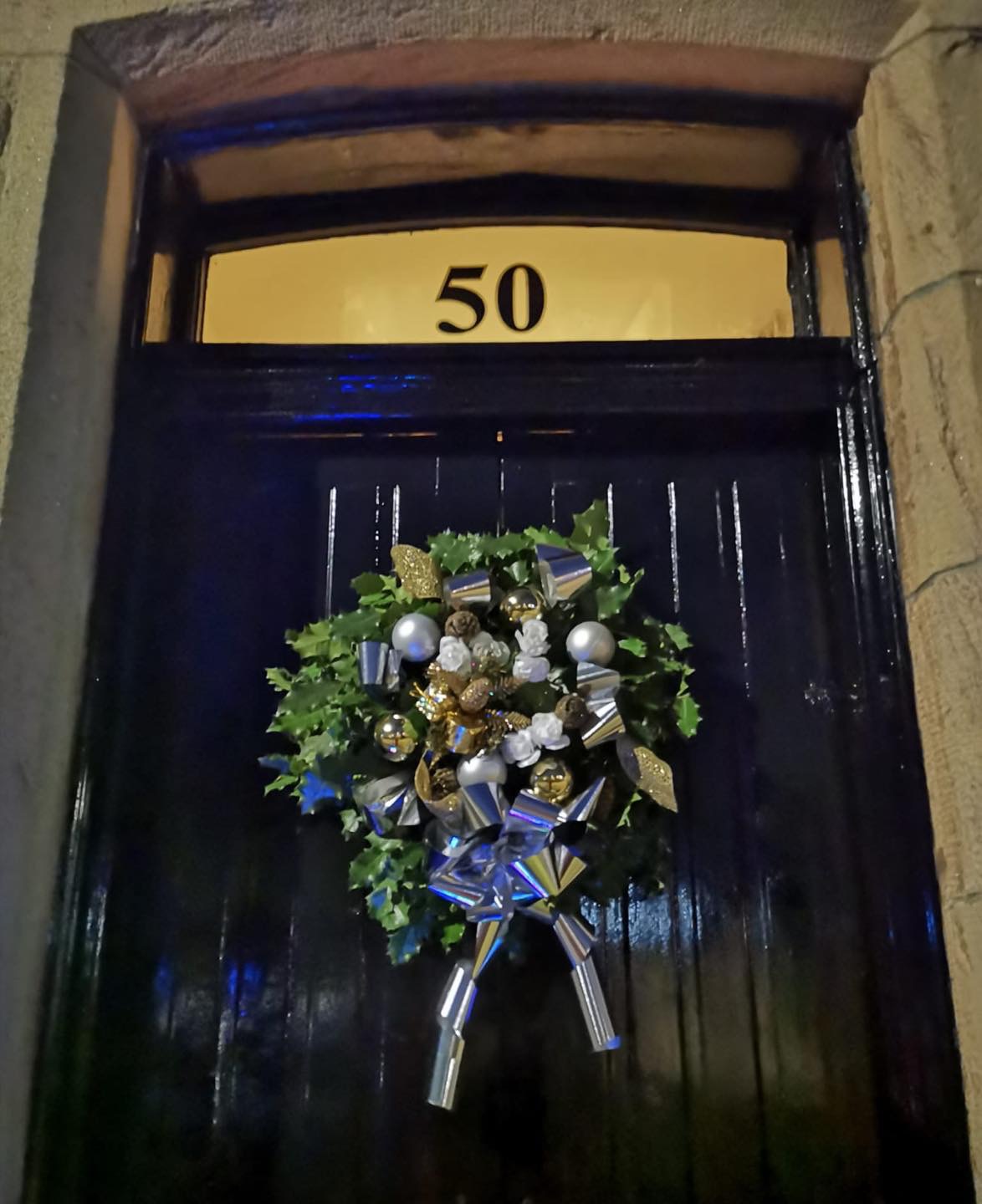 A wreath made from all holly with large ribbons with tails to hang on front door please specify colours in product notes