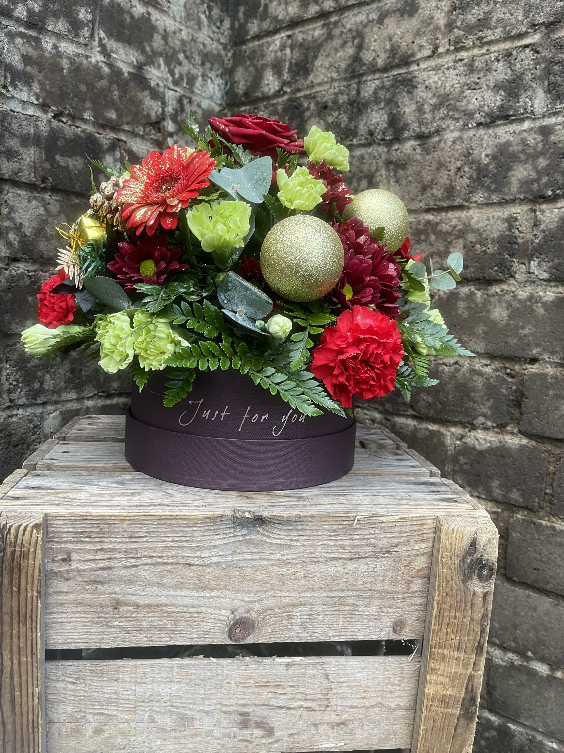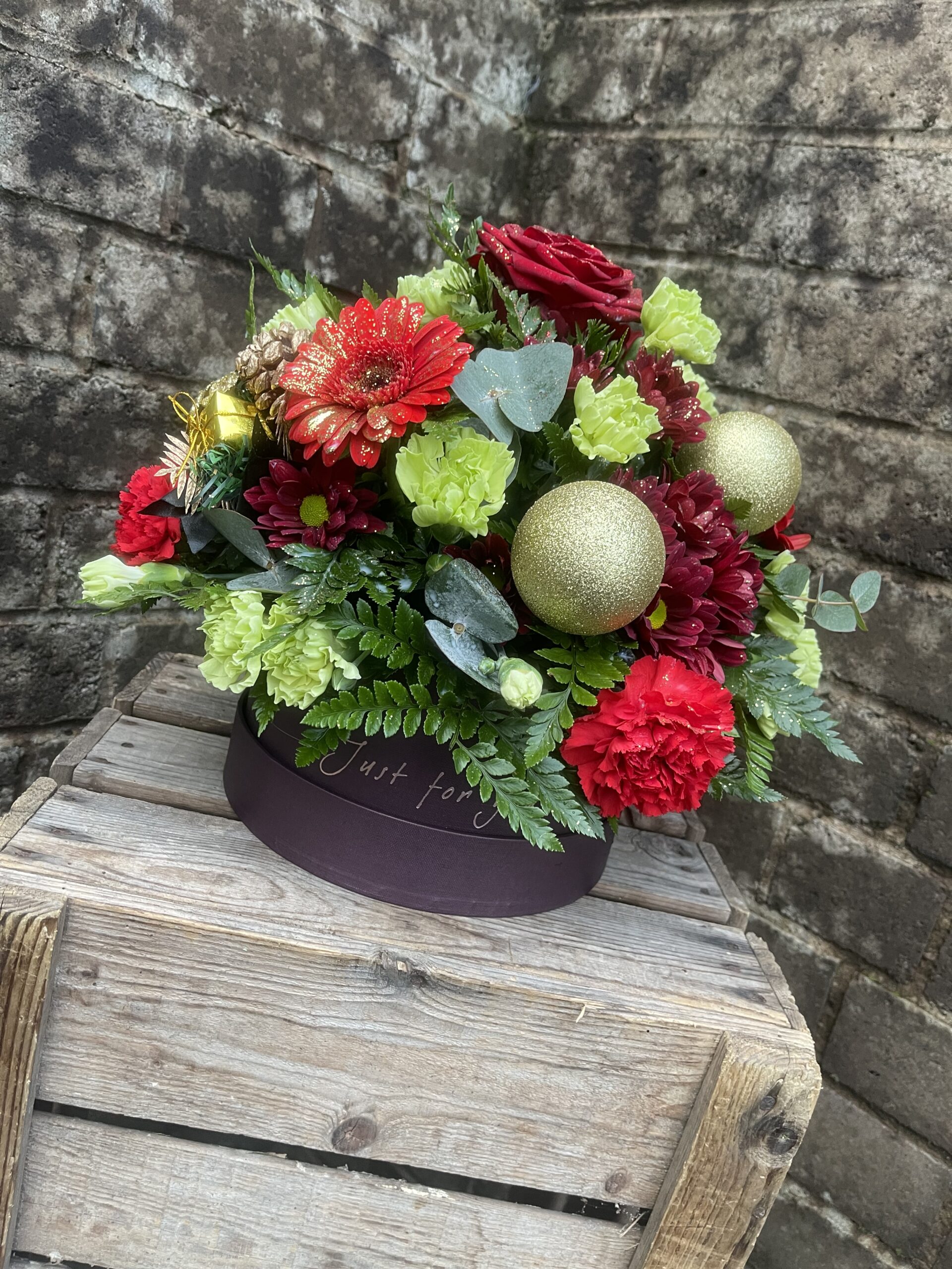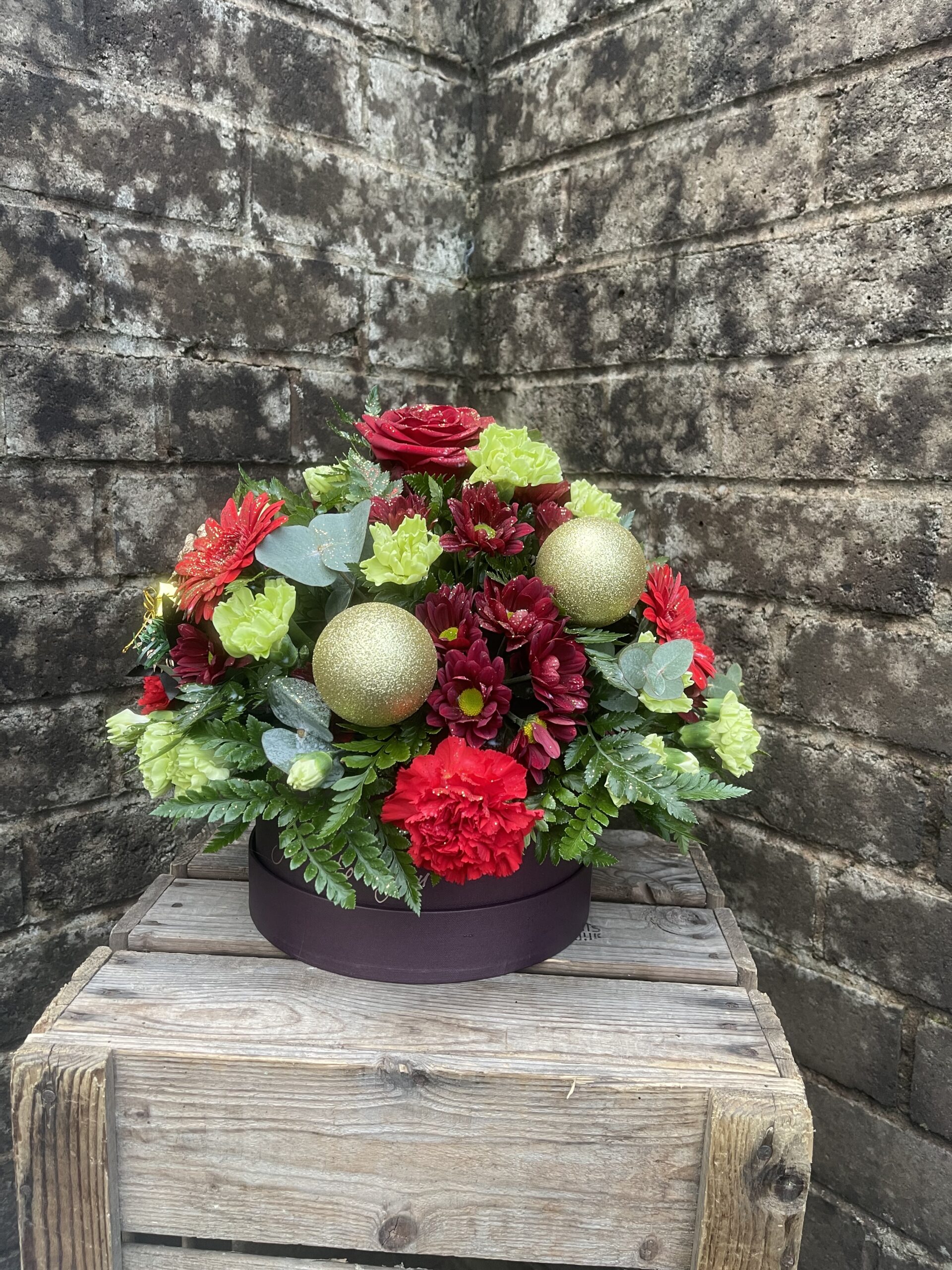 - A festive filled hatbox, created in the colours of your choice. The flowers included within the hatbox May consist of roses, carnations, gerbera, chrysanthemum, thistle ect along with some festive decorations.