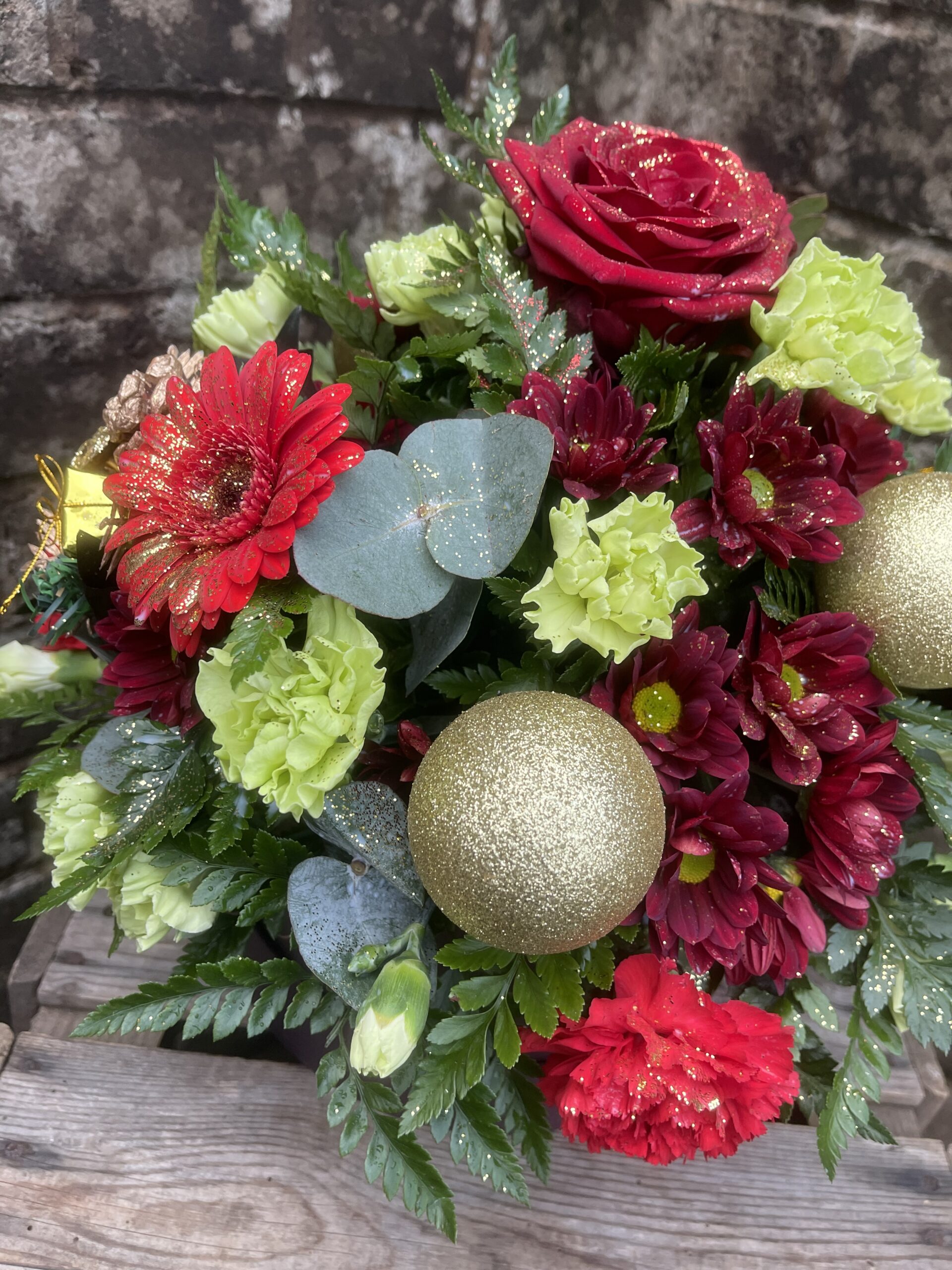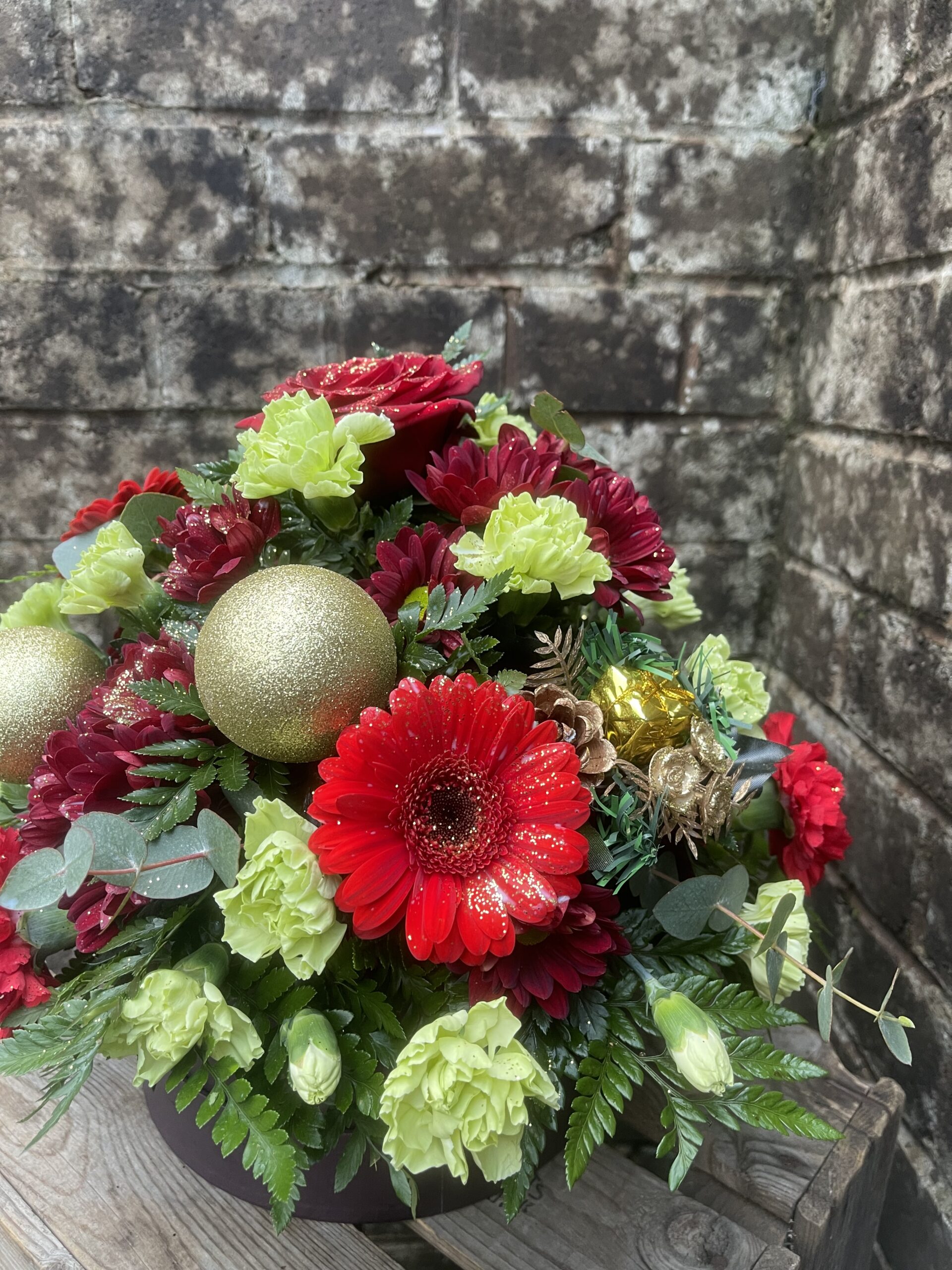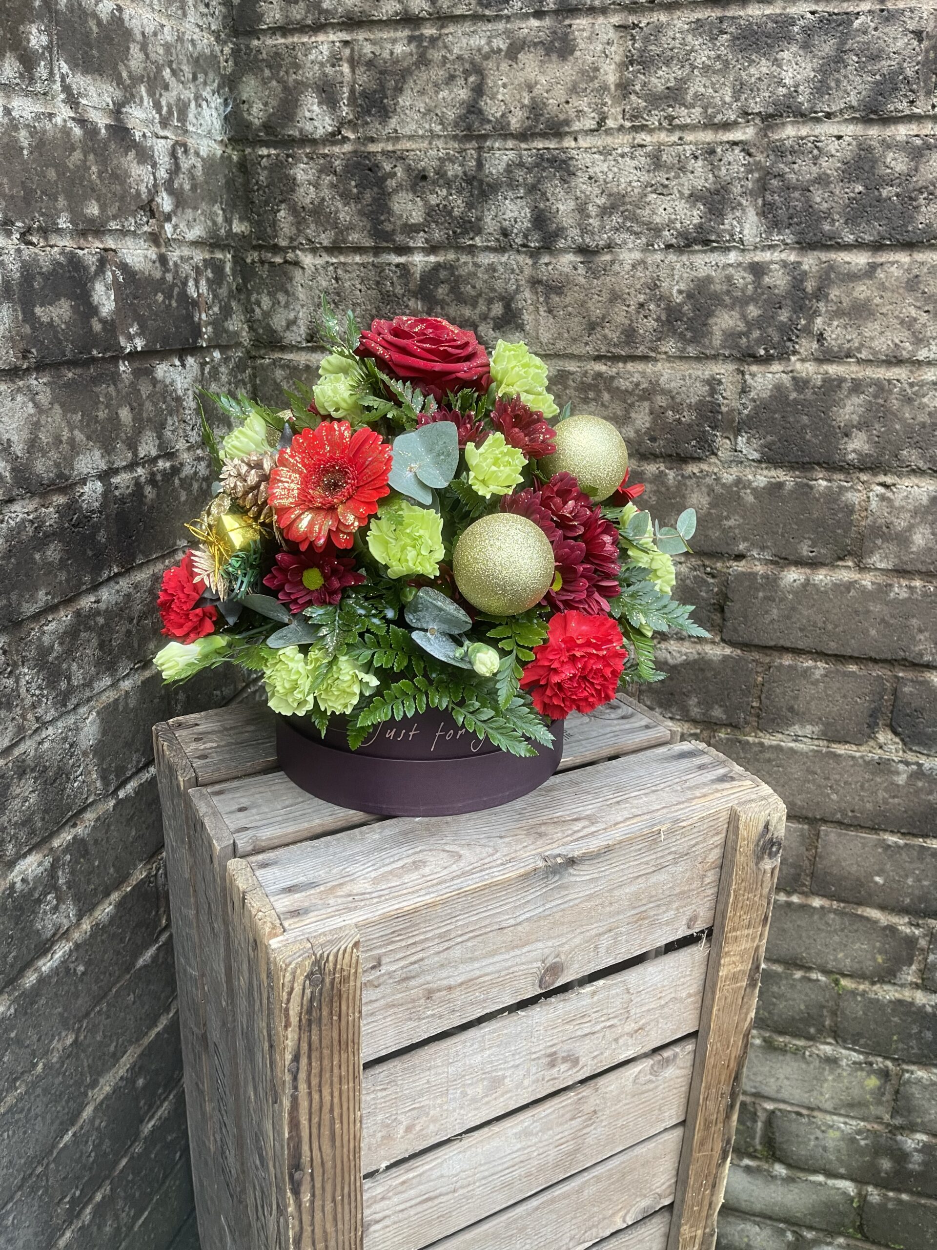 - A festive filled hatbox, created in the colours of your choice. The flowers included within the hatbox May consist of roses, carnations, gerbera, chrysanthemum, thistle ect along with some festive decorations.