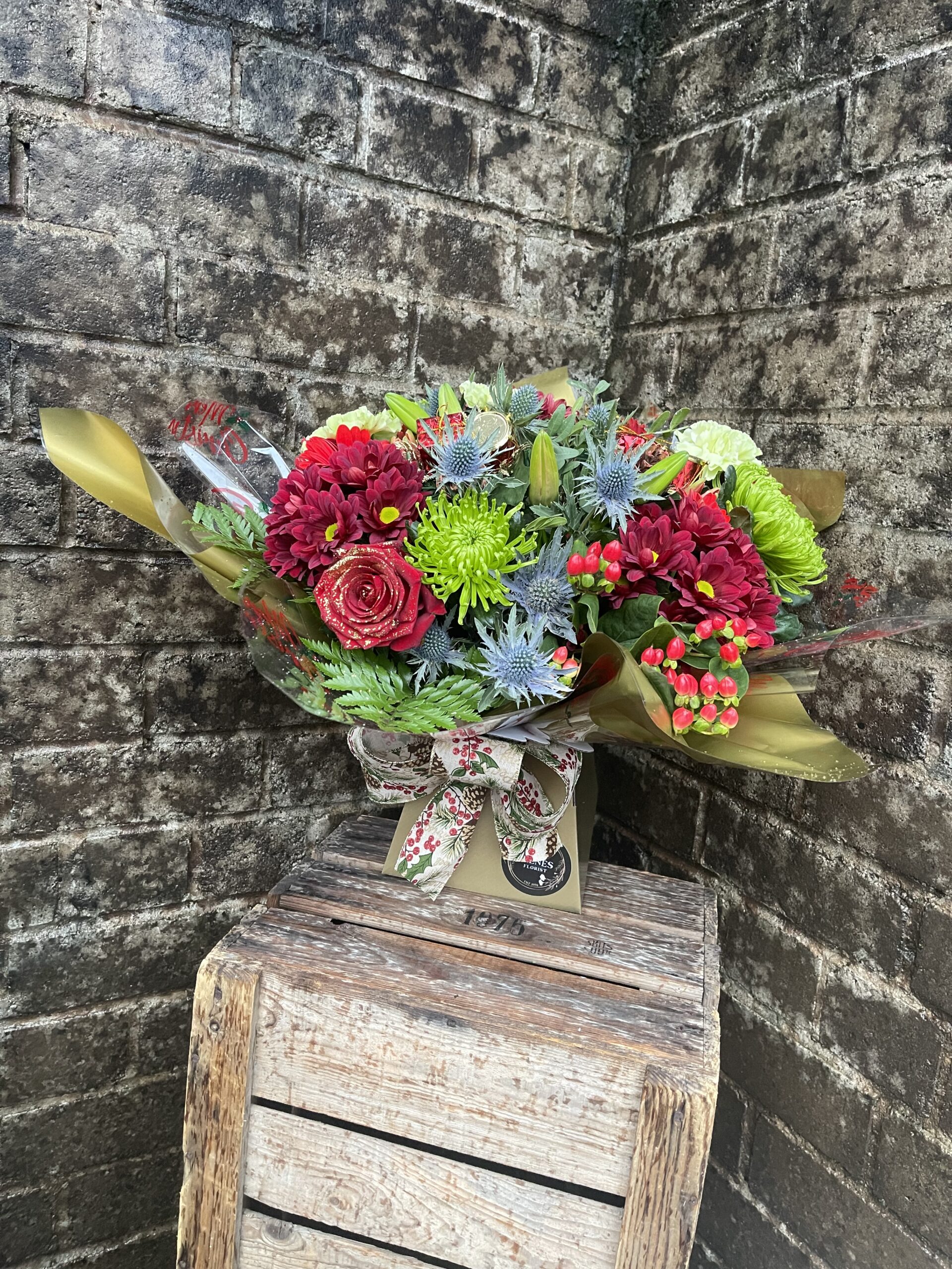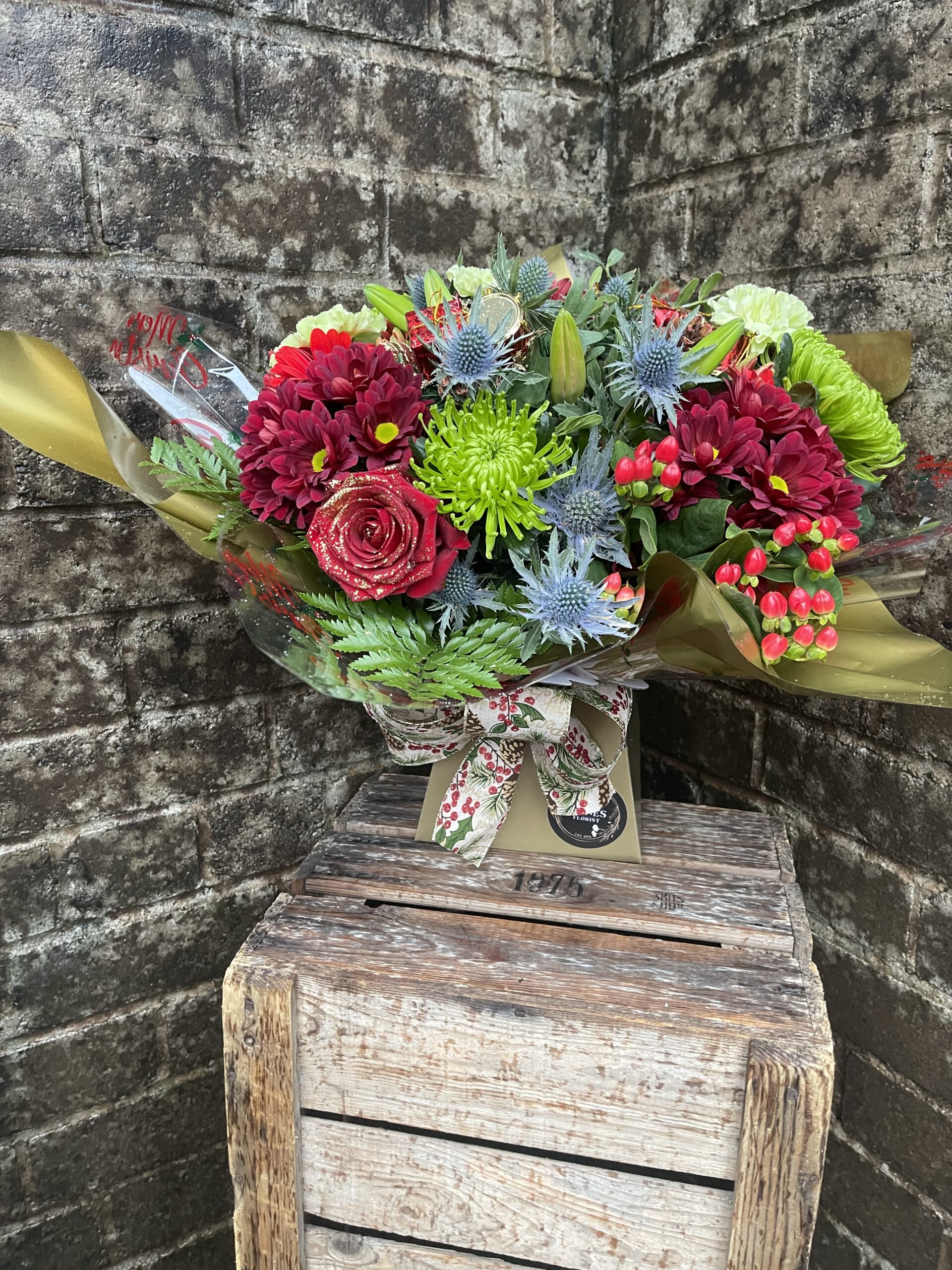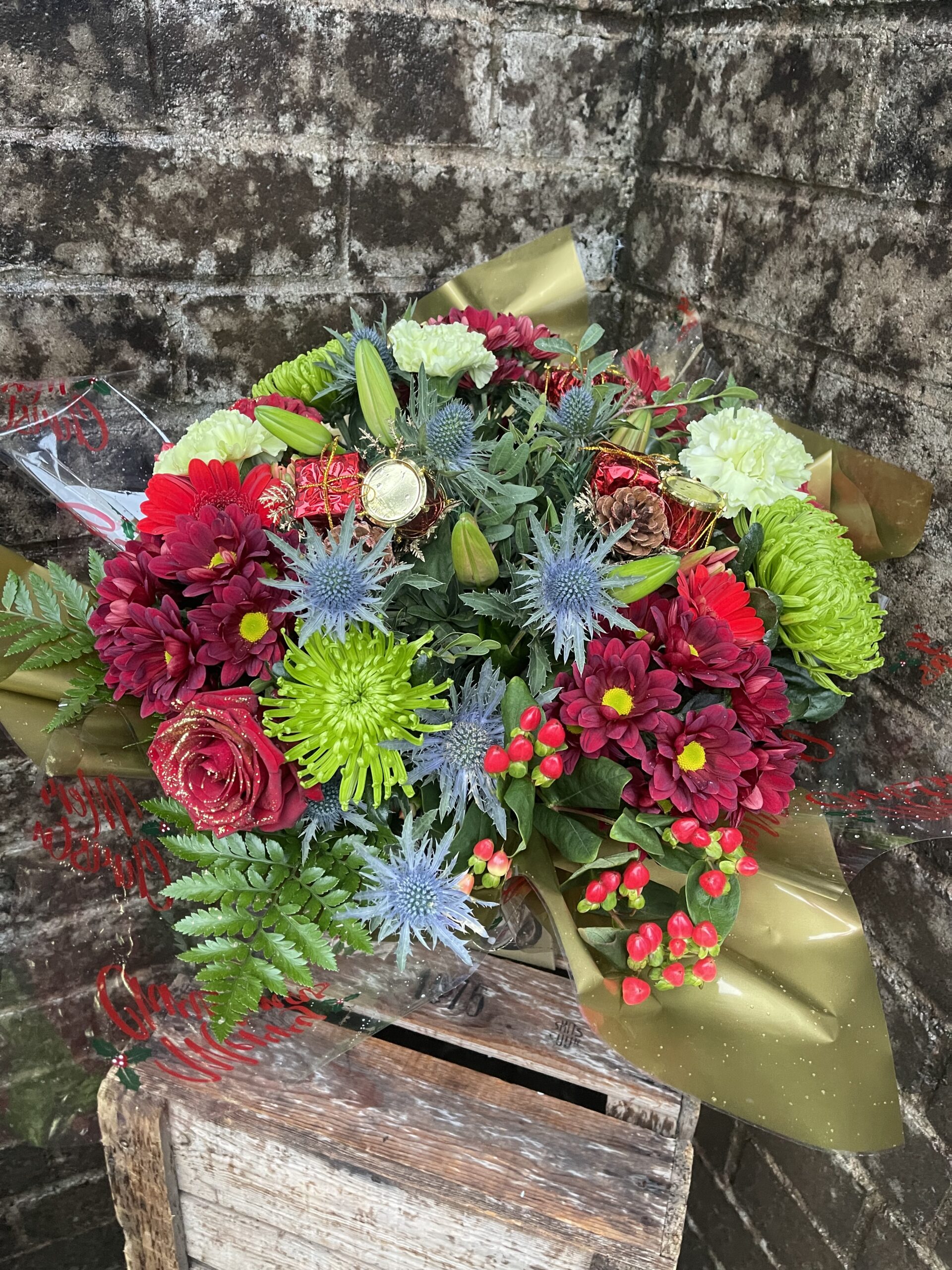 Presented gift wrapped and in water a festive selection of flowers in colours of your choice, flowers included may be lilies, roses, carnations, gerbera, chrysanthemums, thistle, hypericum berry and some festive decorations.