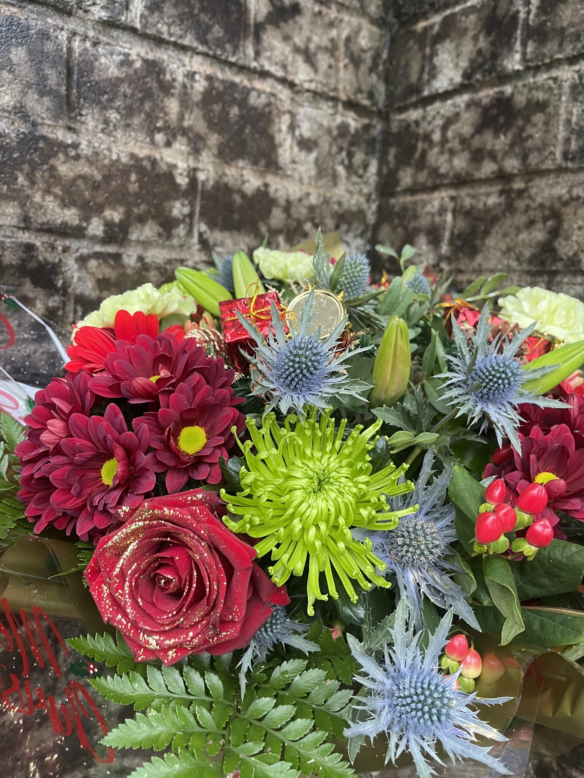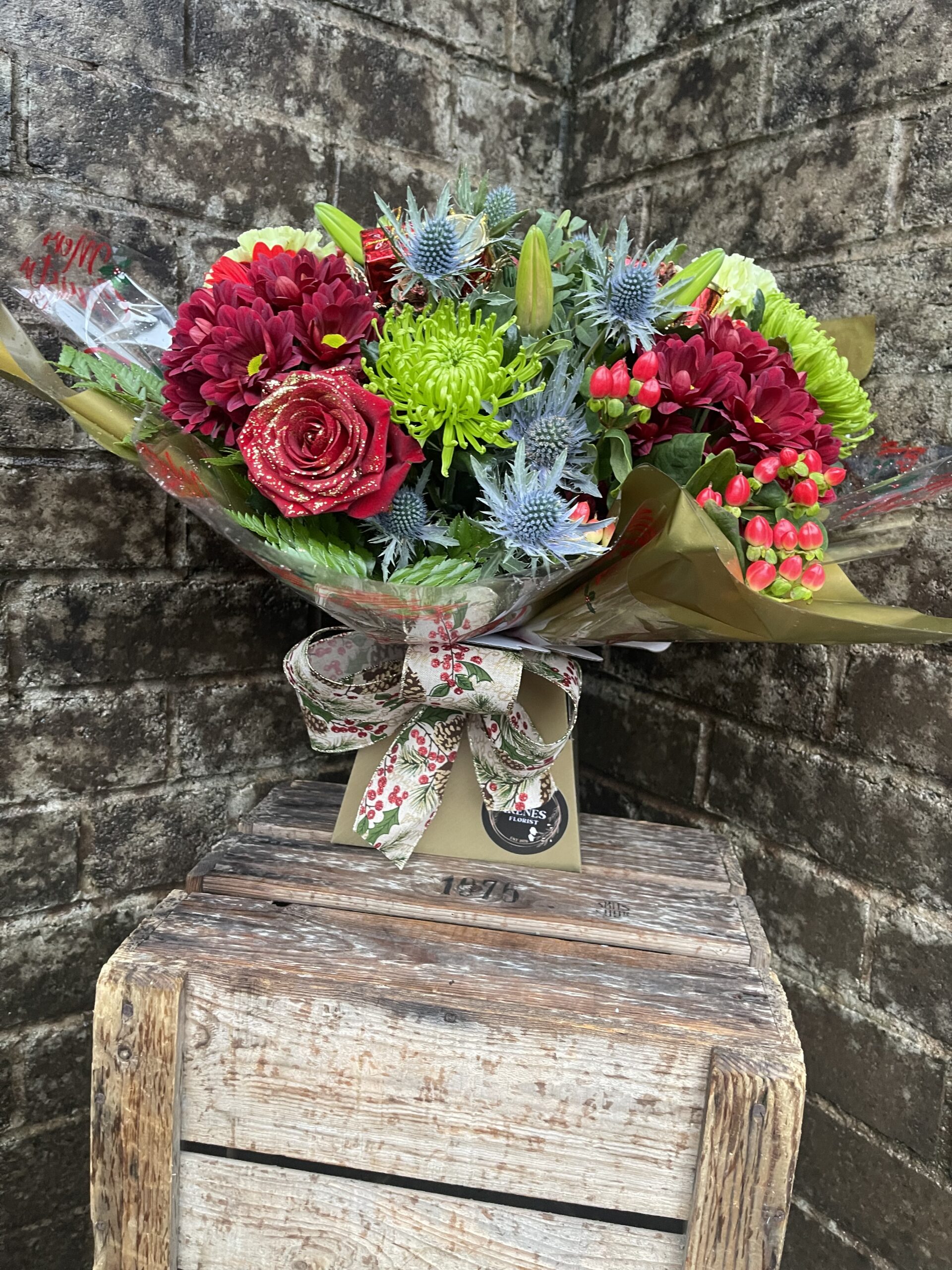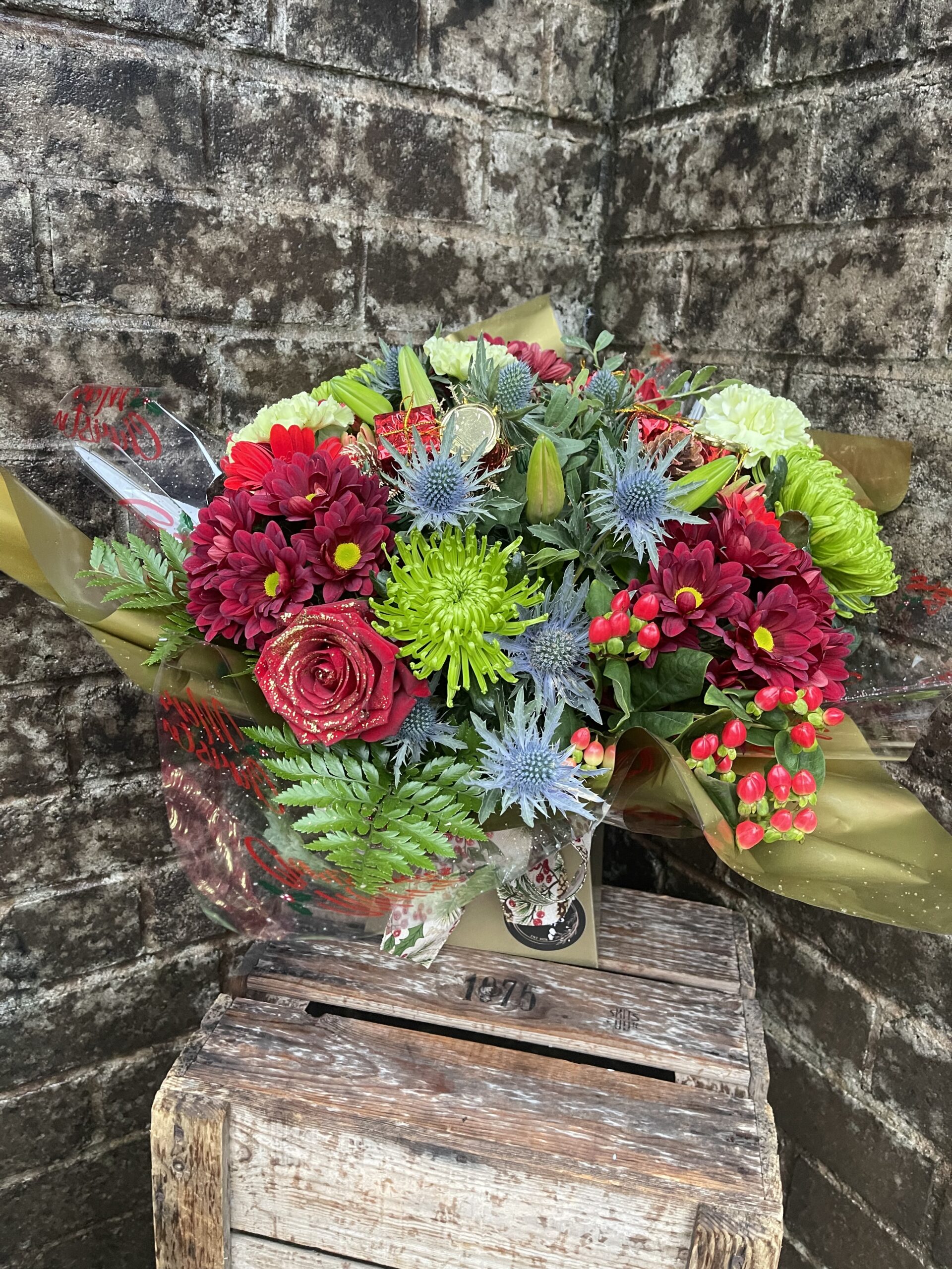 Presented gift wrapped and in water a festive selection of flowers in colours of your choice, flowers included may be lilies, roses, carnations, gerbera, chrysanthemums, thistle, hypericum berry and some festive decorations.