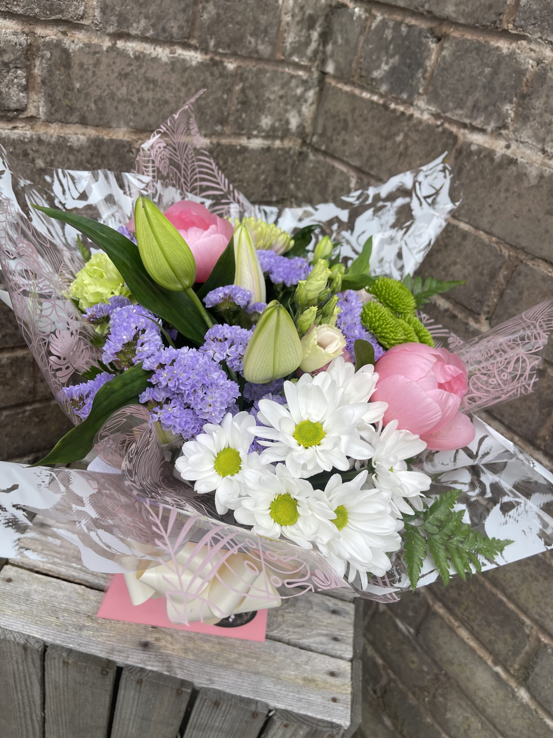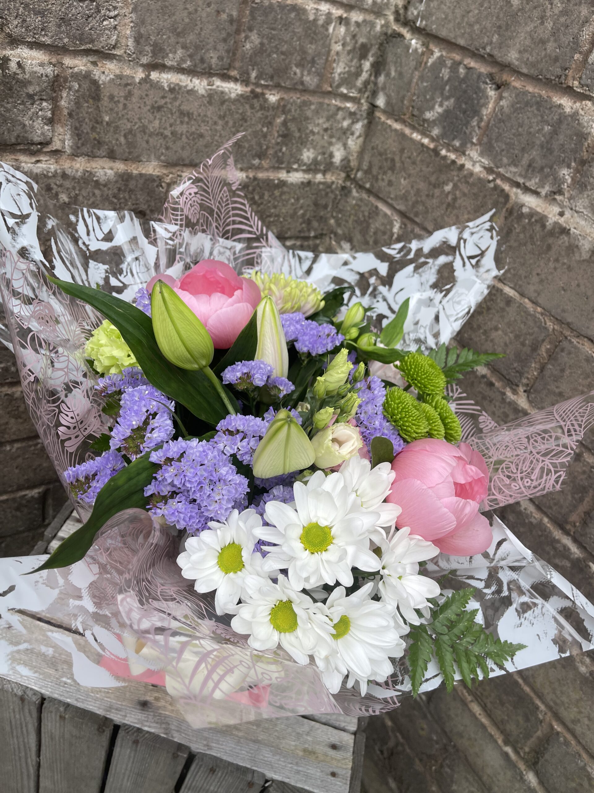 Pretty pink, lilac and white summer bouquet which will include seasonal flowers such as peony’s, hydrangea, or stock