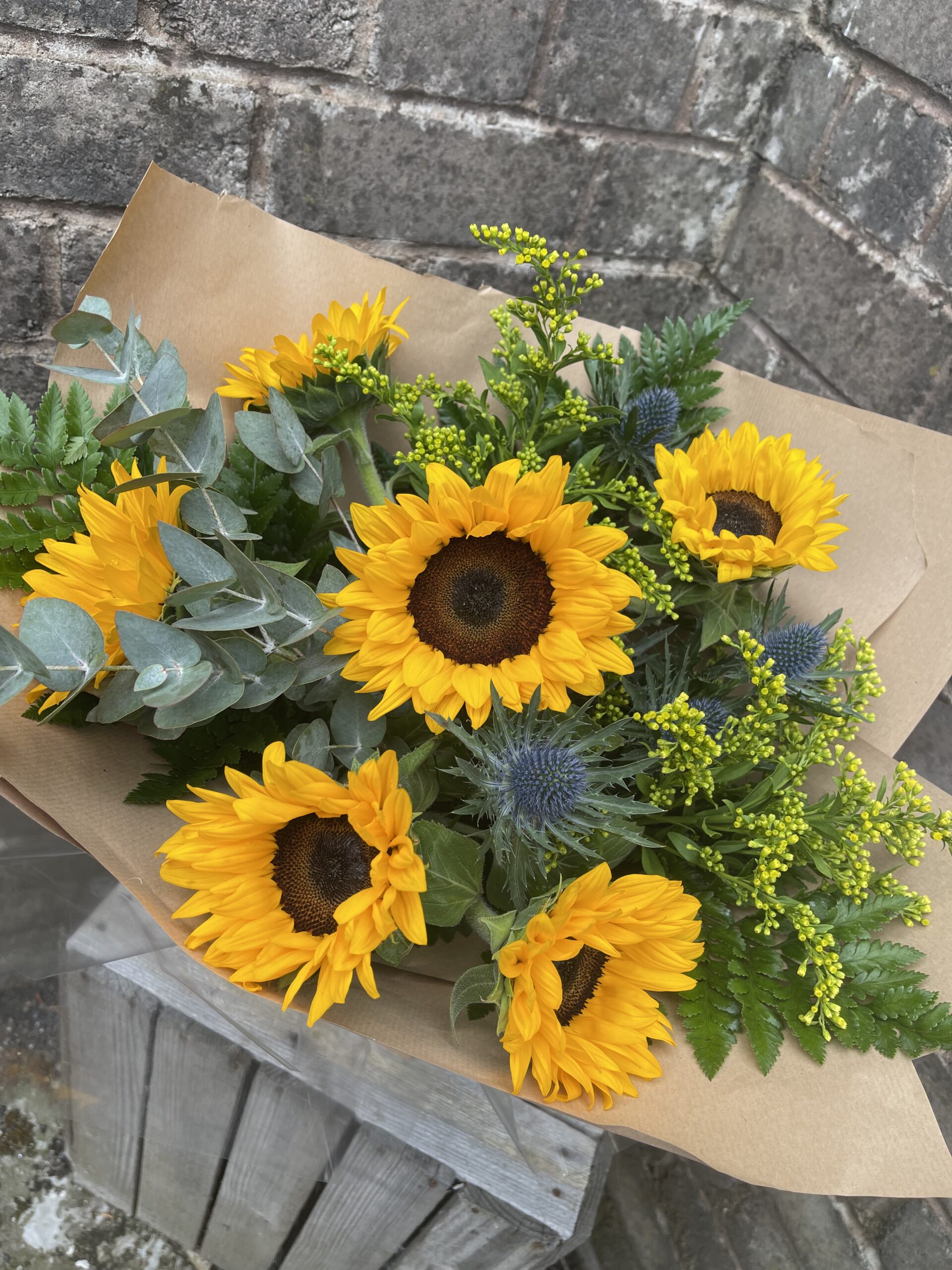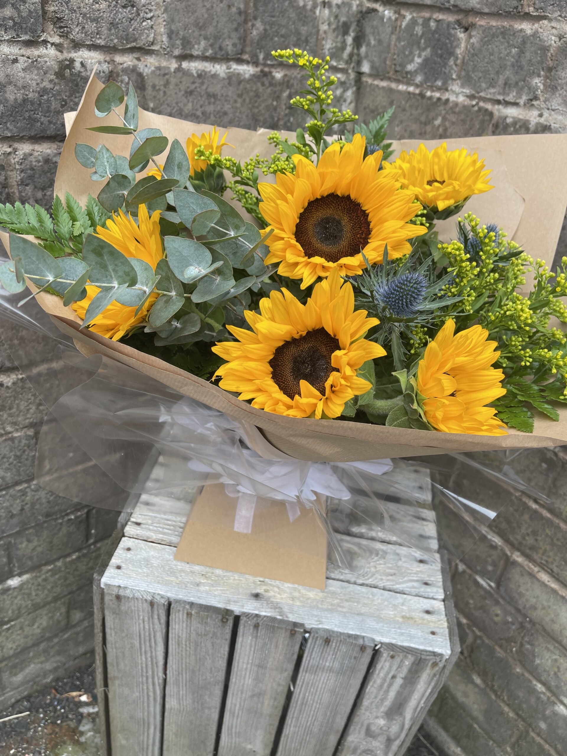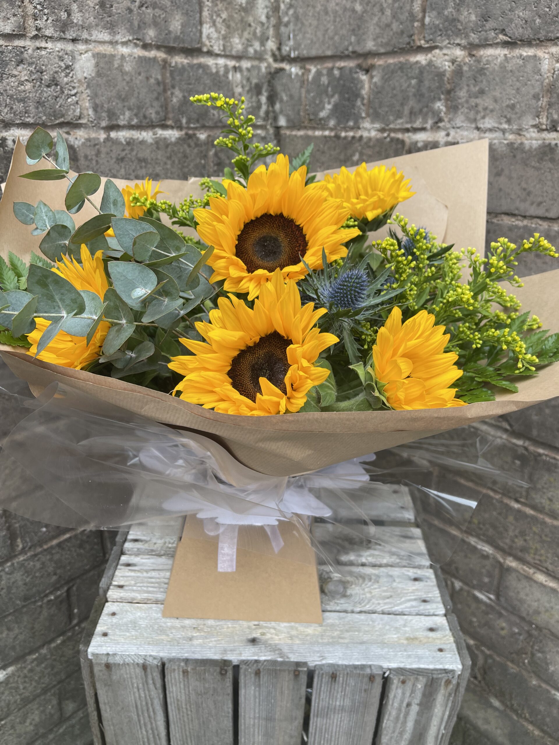 A lovely hand tie of sunflowers with a touch of foliage and thistle š»