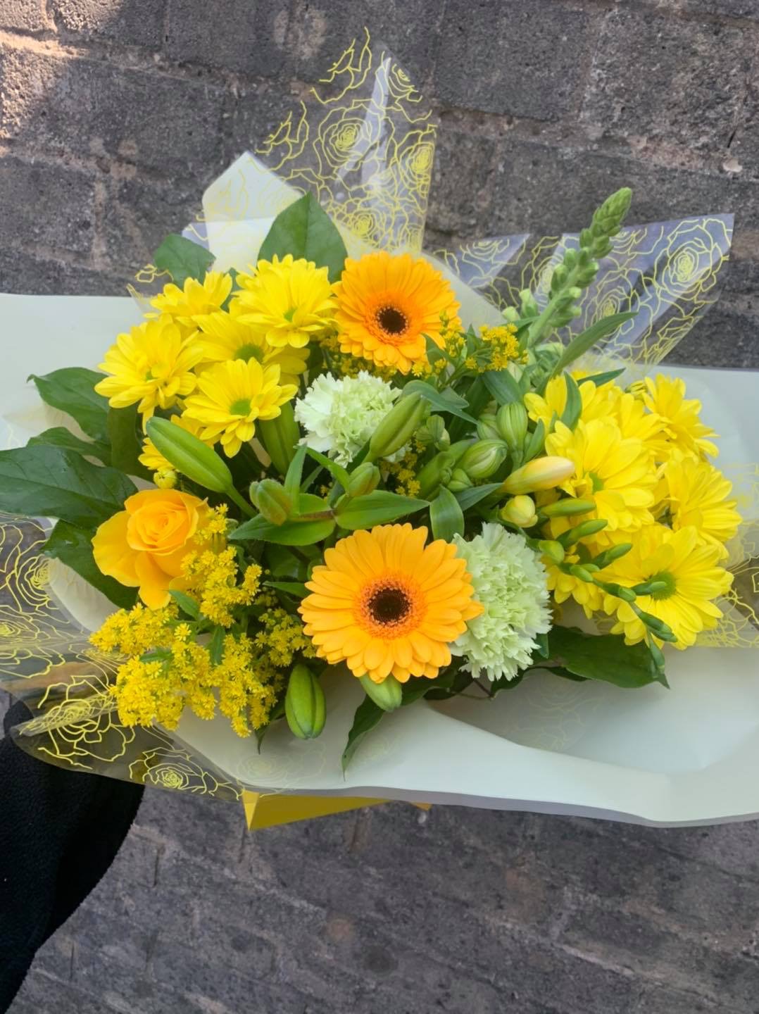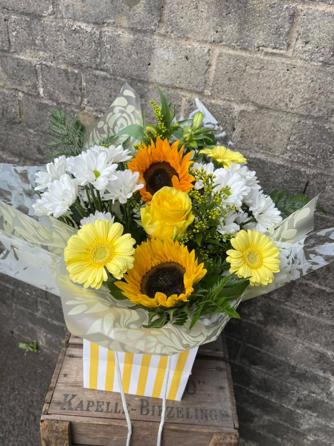 A bouquet presented in a box or gift bag in seasonal Yellow and white tones, flowers may not be exactly as the photo it will depend on flower availability