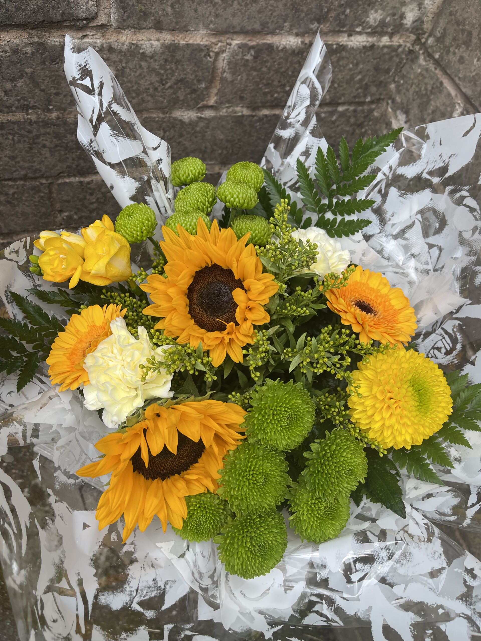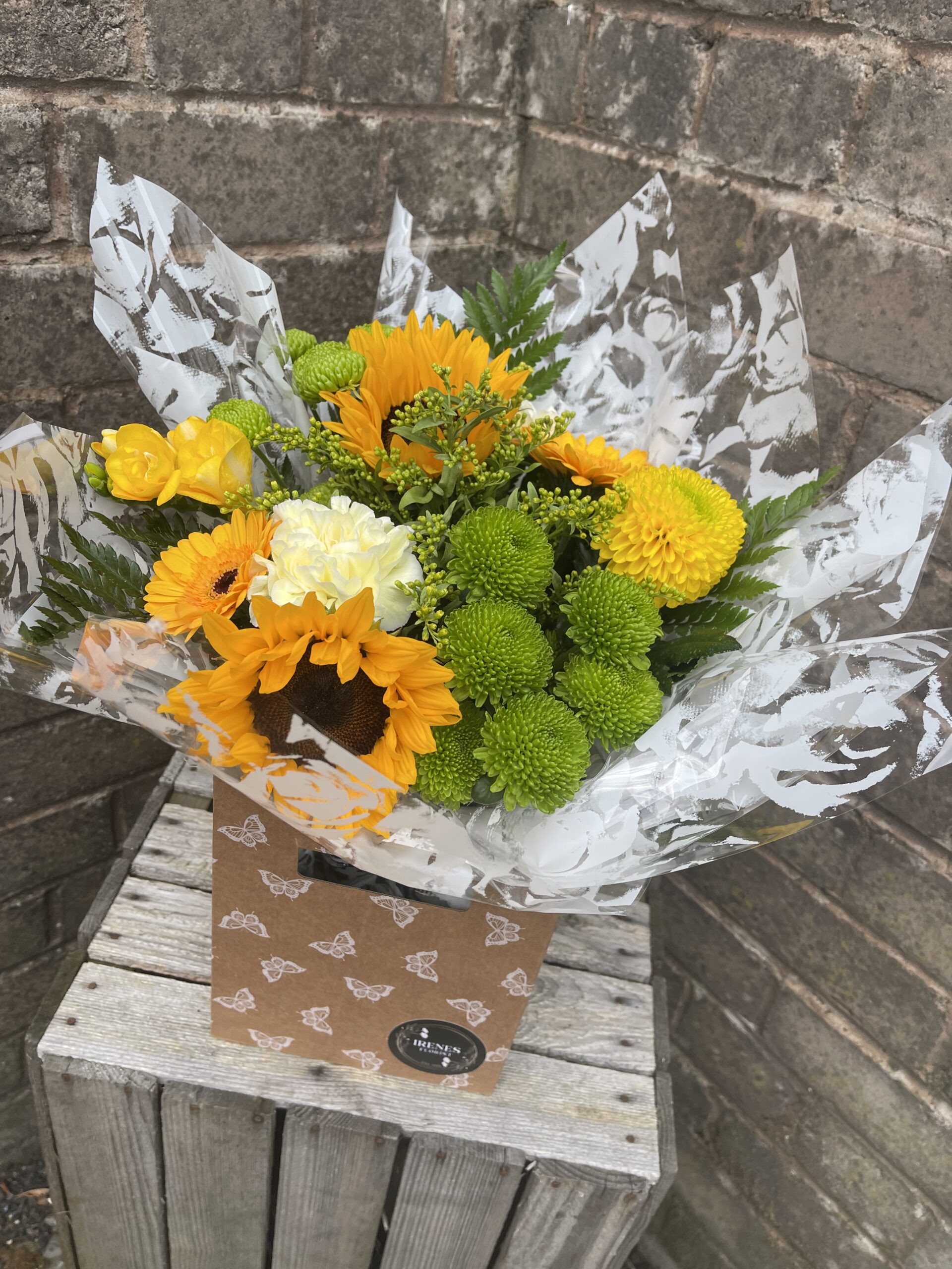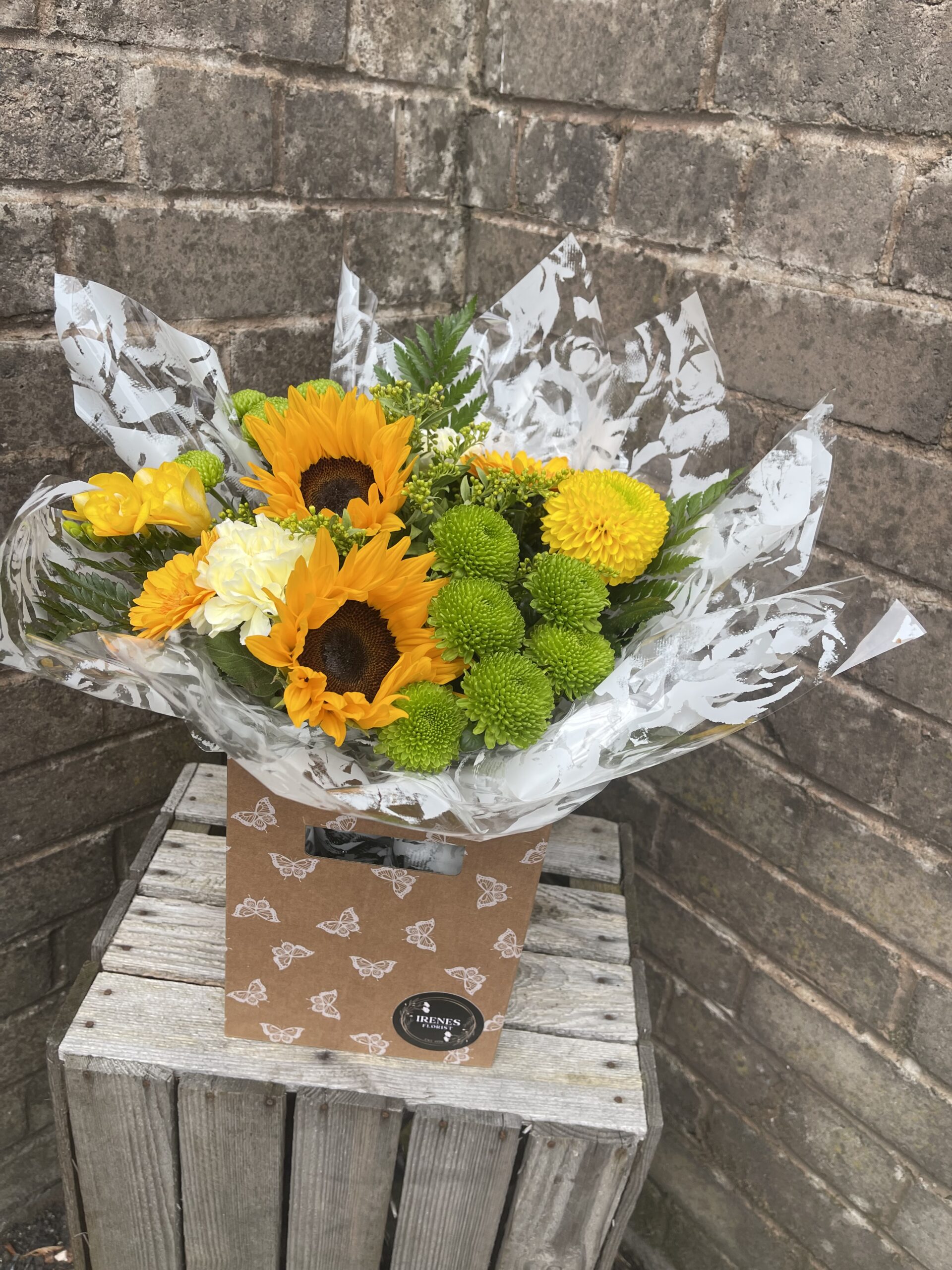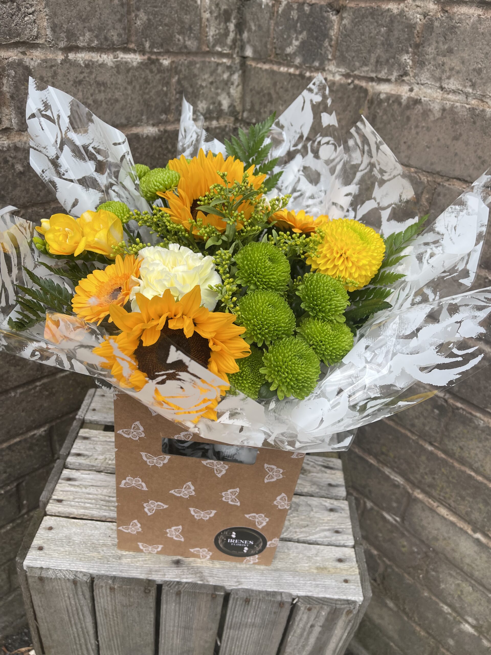A beautiful bouquet arranged in a box or bag in lovely yellows creams and greens and includes a sunflower š»